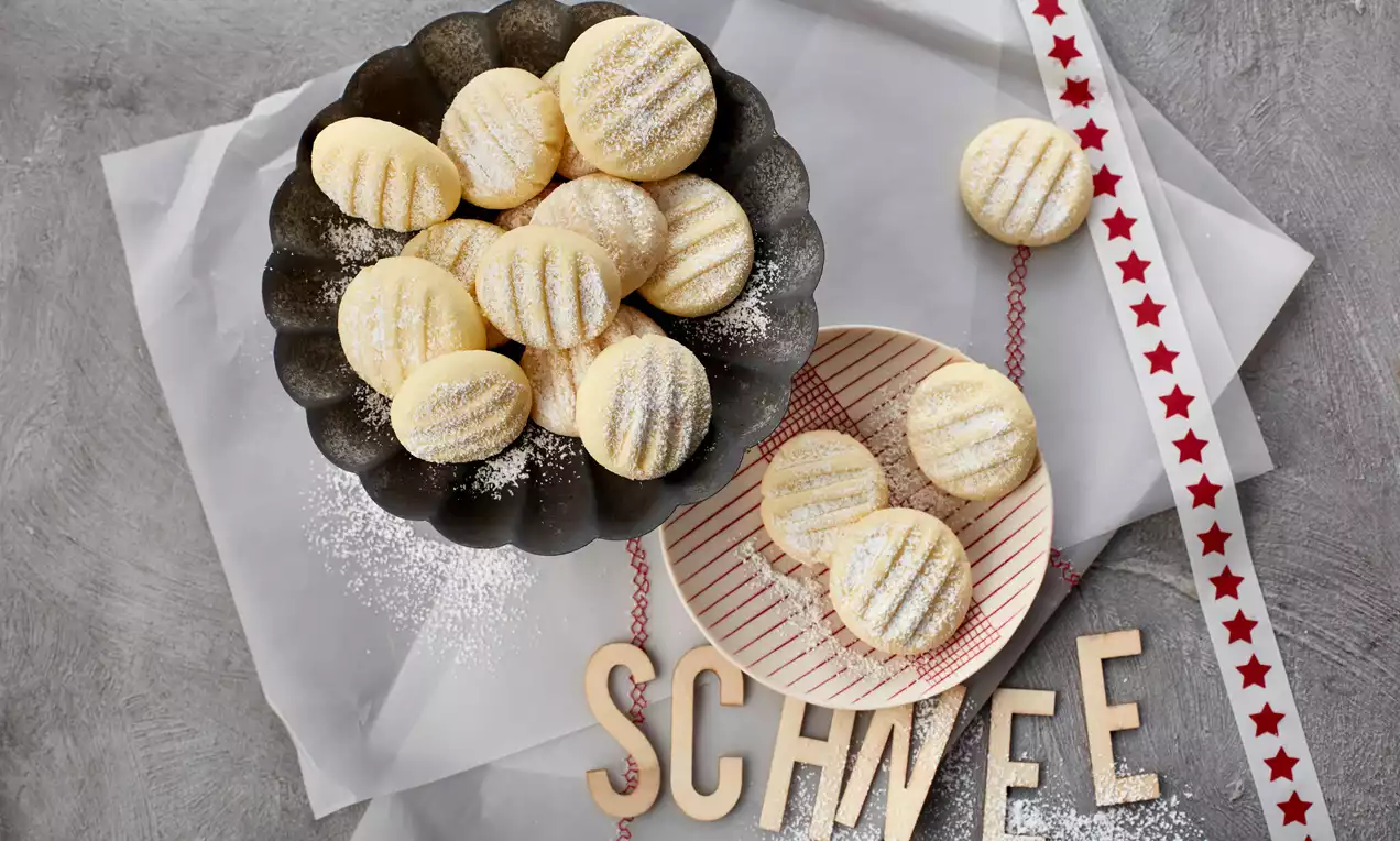 Die Schneeflöckchen mit dem Backpapier auf einen Kuchenrost ziehen, etwas abkühlen lassen und dann mit Puderzucker bestreuen.