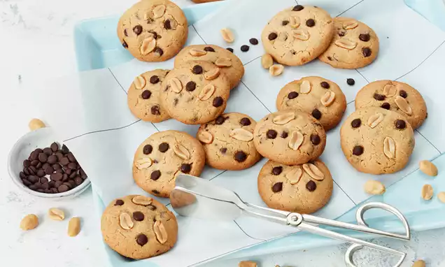 Beide Teighälften in jeweils 12 gleich große Portionen teilen und zu Kugeln formen. Kugeln in die gehackten Haselnüssen drücken. Etwa 12 Kugeln auf das Backpapier legen und flach drücken. Anschließend mit den restlichen Chunks belegen, etwas andrücken und backen.