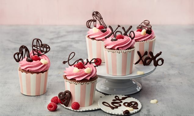 Mit den Schokoladen-Dekoren, Schoko-Herzen und Himbeeren verzieren und die Himbeer-Cupcakes 1 Std. in den Kühlschrank stellen.