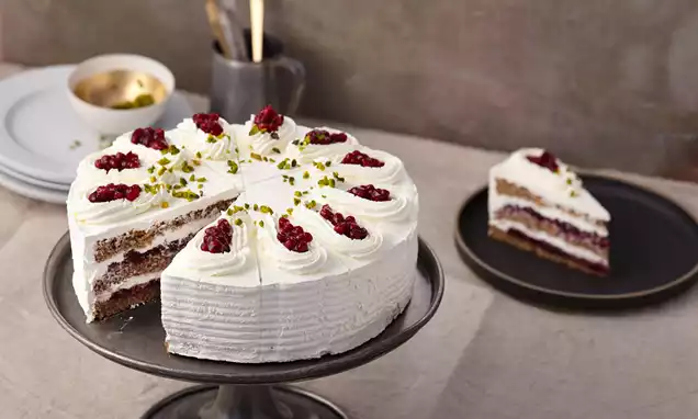 Den Tortenboden aus der Form lösen, auf einen mit Backpapier belegten Kuchenrost stürzen und erkalten lassen. Beide Böden einmal waagerecht durchschneiden. Die unteren Herzböden jeweils auf ein großes Brett und eine Platte geben.
