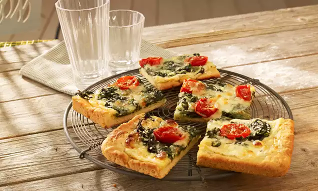 Gut abgetropfte Früchte auf dem Teig verteilen, dabei am Rand 1 cm frei lassen und mit Vanillin-Zucker bestreuen.