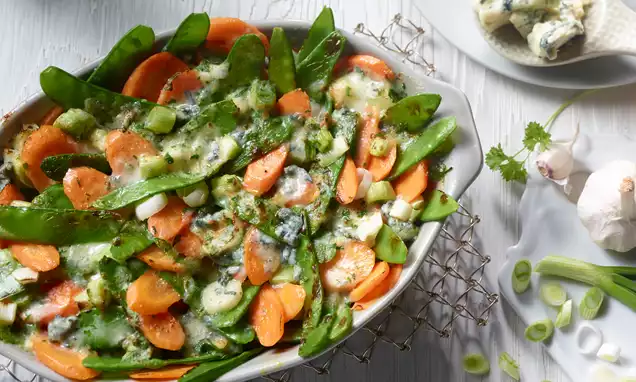 Crème légère in die Süßkartoffelsuppe rühren und alles pürieren. Säfte hinzufügen und mit Zucker abschmecken. Die Süßkartoffelsuppe mit den gebratenen Süßkartoffelmotiven, Lachswürfeln und Garnelen anrichten.