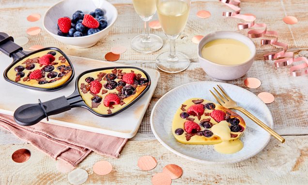 Süßes Raclette zum Nachtisch mit Pfannkuchenteig, frischem Obst und einer leckeren Vanillesoße- Süßes Raclette-Rezept ganz einfach köstlich und perfekt!
