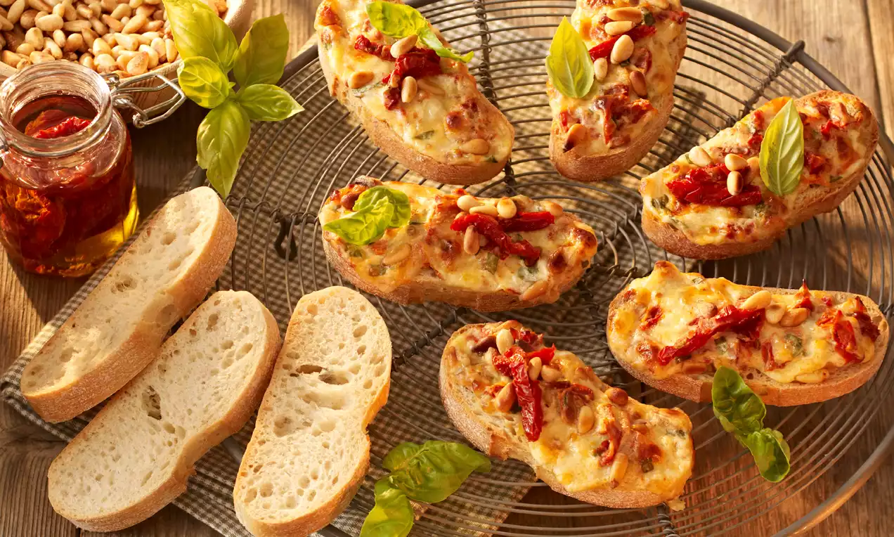 Pinienkerne, Tomatenstückchen, Basilikum, Crème légère, Joghurt und Gouda verrühren und mit Pfeffer abschmecken. Ciabatta in etwa 15 Scheiben schneiden und auf das Backblech legen. Creme darauf verteilen und backen.