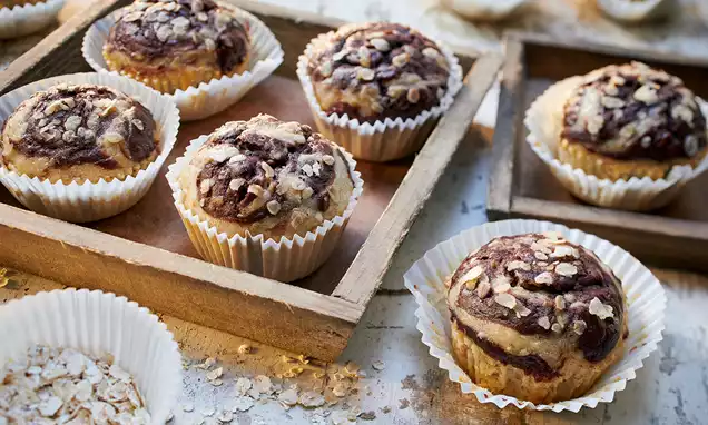 Vegane Apfel-Knusper-Muffins mit Hilfe von 2 Gabeln aus der Form nehmen und auf einem Kuchenrost erkalten lassen.