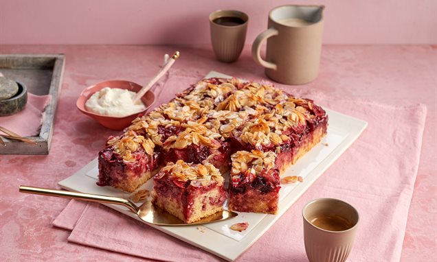 Margarine mit Zucker und veganer Schlagcreme in einem kleinen Topf zerlassen. Mandeln hinzufügen und unter Rühren etwa 3 Min. kochen. Die Mandelhaube nach 45 Min. Backzeit gleichmäßig auf dem Kuchen verteilen und den veganen Kirschkuchen fertig backen.
