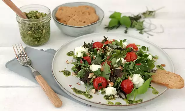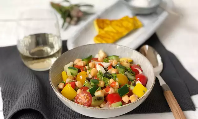 Gurke waschen, entkernen und in kleine Würfel schneiden. Tomate waschen und in kleine Würfel schneiden. Creme VEGA in eine Schüssel geben und die Gurken- und Tomatenwürfel sowie die gehackte Minze dazugeben. Mit Chiliflocken und Salz abschmecken und bis zum Servieren in den Kühlschrank stellen.