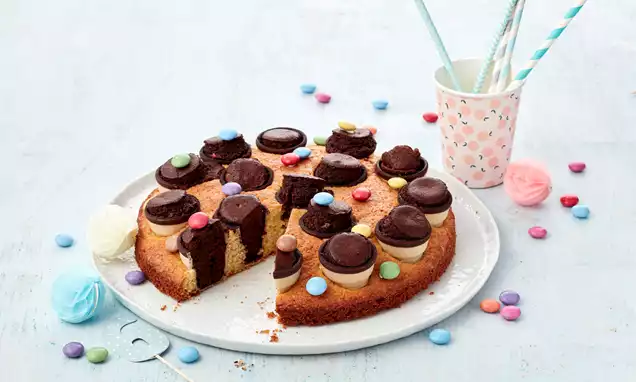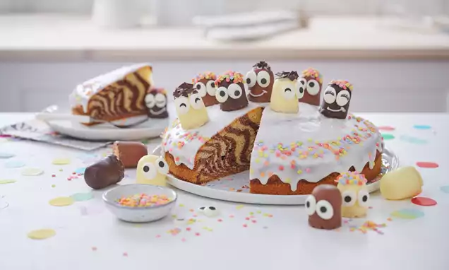 Mehl mit Backin in einer Rührschüssel mischen. Übrige Zutaten - bis auf den Kakao - hinzufügen und alles mit einem Mixer (Rührstäbe) kurz auf niedrigster, dann auf höchster Stufe 2 Min. zu einem glatten Teig verarbeiten. Teigmenge halbieren und unter eine Hälfte den Kakao rühren. Zunächst 1-2 Teelöffel hellen Teig in die Mitte der Mulden geben. Jeweils direkt darauf 1-2 Teelöffel dunklen Teig geben. Auf diese Weise hellen und dunklen Teig immer abwechselnd direkt übereinander einfüllen. Form auf dem Rost in den Backofen schieben.