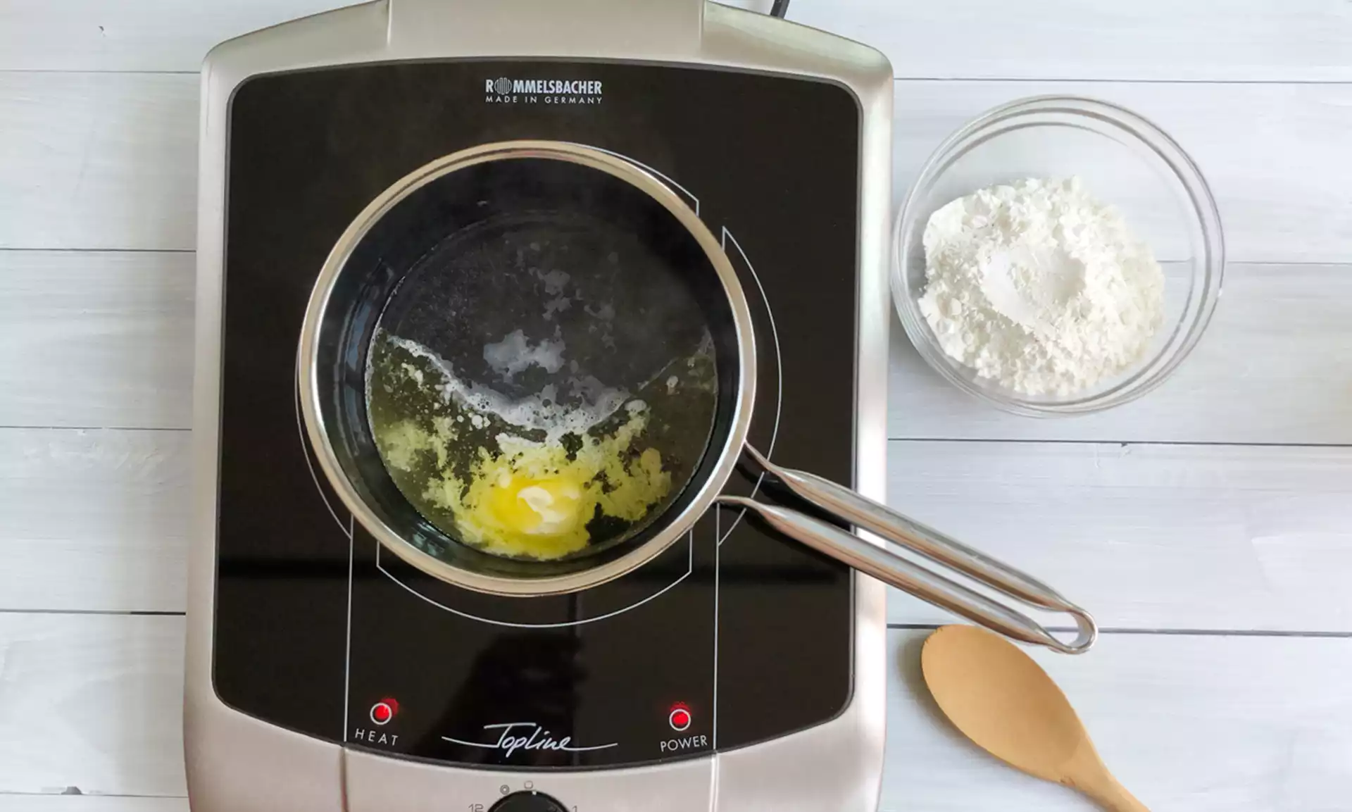 Wasser und Fett in einen kleinen Topf (am besten einen Stieltopf) geben und aufkochen.